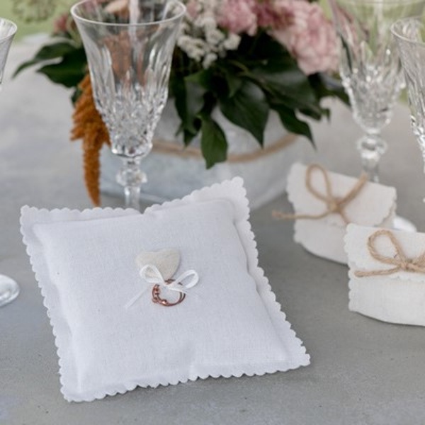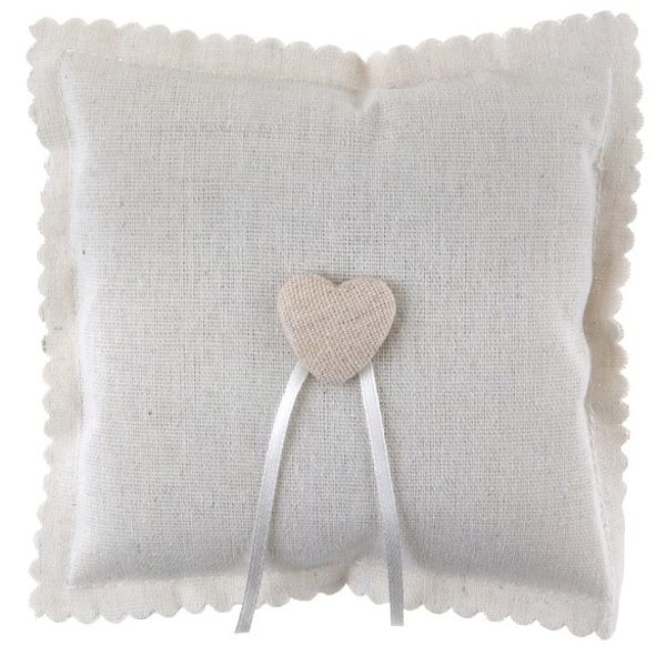 Bavlněný bílý svatební polštářek na prstýnky se srdíčkem a saténovou stuhou