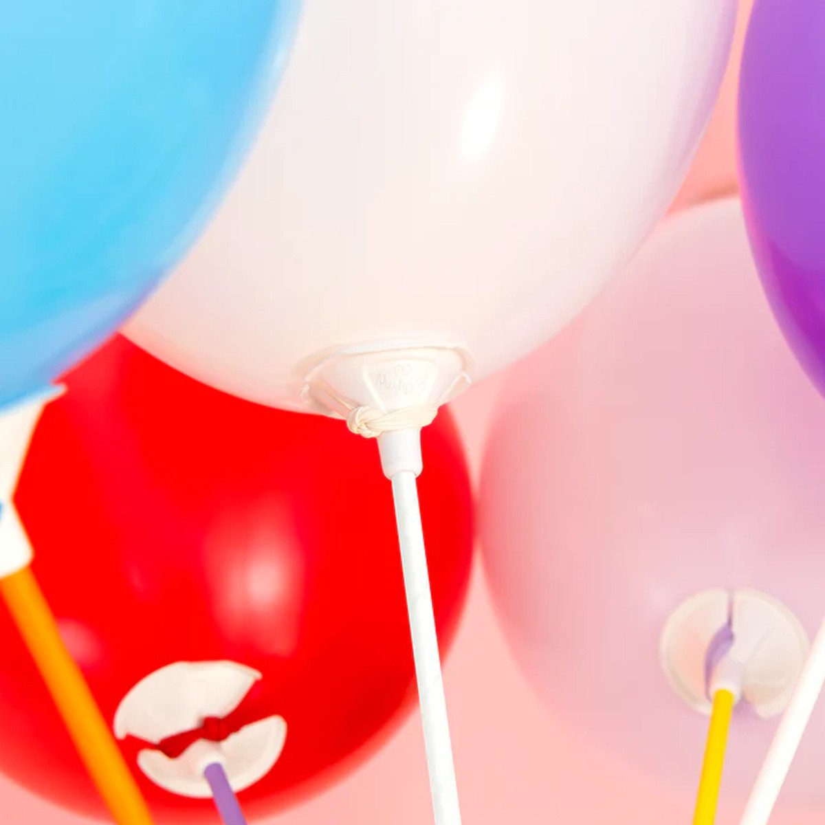 Tyčka s kloboučkem na balónek je levným a rychlým řešením pro uchycení balónků naplněných vzduchem. Nebudete potřebovat žádné provázky ani uzlíky, nafouknutý balónek jednoduše provléknete speciálními drážkami a upevníte přímo k plastovému kloboučku.