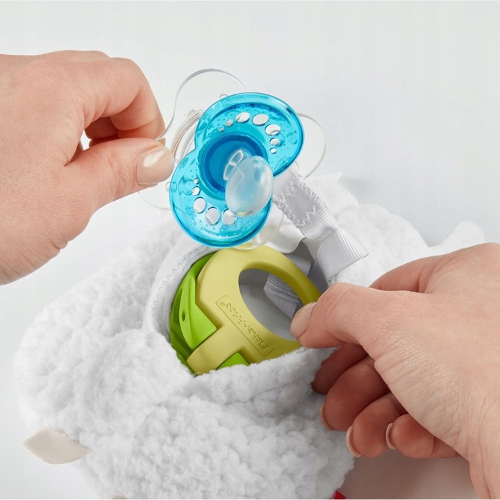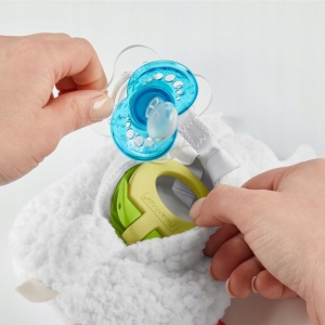 Úložný prostor a držák na dudlík Fisher-Price ve tvaru bílé lamy je unikátní produkt, který má dvojí funkci. Připevněte oblíbený dudlík vašeho miminka (dudlík není součástí balení) k měkkému plyšovému zvířátku, aby se nikdy neztratil a byl vždy nablízku.