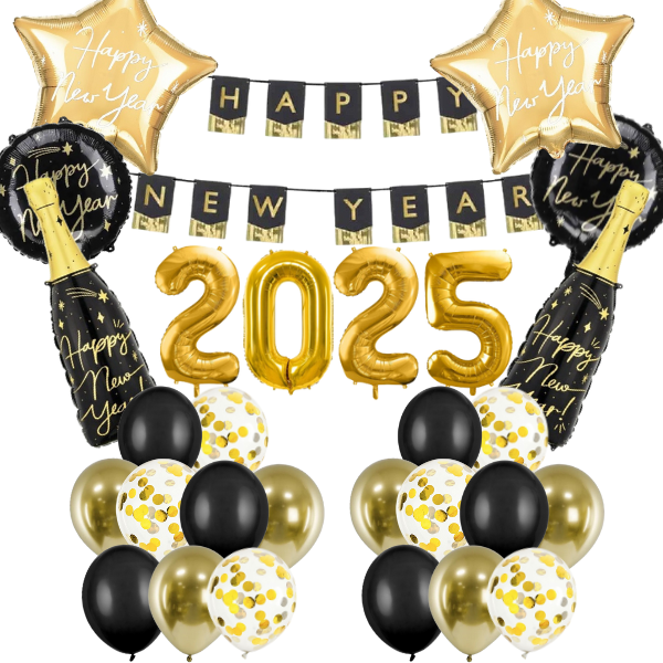 Set obsahuje: 6 latexových balónků transparentních se zlatými konfetami (30 cm), 2 fóliové balónky zlatá hvězda "Happy New Year" (40 cm), 2 fóliové balónky černé "Happy New Year" (35 cm), 2 fóliové balónky ve tvaru lahve "Happy New Year" (27 x 88 cm), 1 fóliový balónek číslo "0" zlatý (86 cm), 2 fóliové balónky číslo "2" zlaté (86 cm), 1 fóliový balónek číslo "5" zlatý (86 cm), 1 banner černý "Happy New Year" (135 x 16,5 cm), 16 latexových balónků černých (30 cm) a 6 latexových balónků chromových zlatých (33 cm).