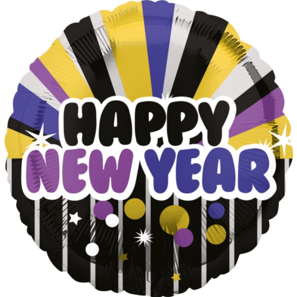 Fóliový balónek s nápisem "Happy New Year" kulatý s pruhy a motivem konfet je dobrou volbou pro výzdobu silvestrovské párty.