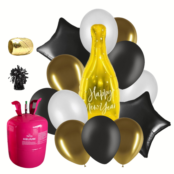 Dodejte své silvestrovské oslavě luxusní šmrnc! Tento černo-zlatý helium buket se silvestrovskou láhví je elegantní dominantou dekorací - skvěle se hodí k vstupu, fotokoutku i slavnostnímu stolu. Sada obsahuje vše potřebné včetně helia, takže dekoraci připravíte snadno a rychle.