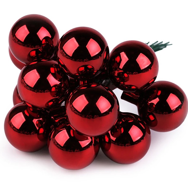 Malé tmavě červené lesklé skleněné baňky vyniknou zakomponované ve vánočních vazbách, věncích, truhlících a různých dekoracích.
