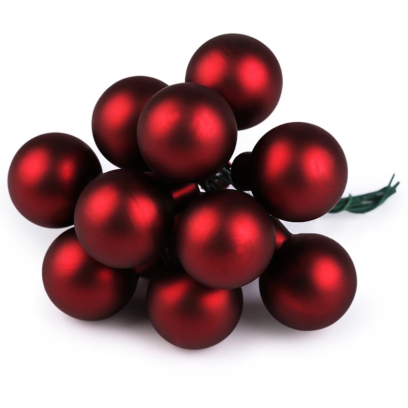 Malé tmavě červené matné skleněné baňky vyniknou zakomponované ve vánočních vazbách, věncích, truhlících a různých dekoracích.