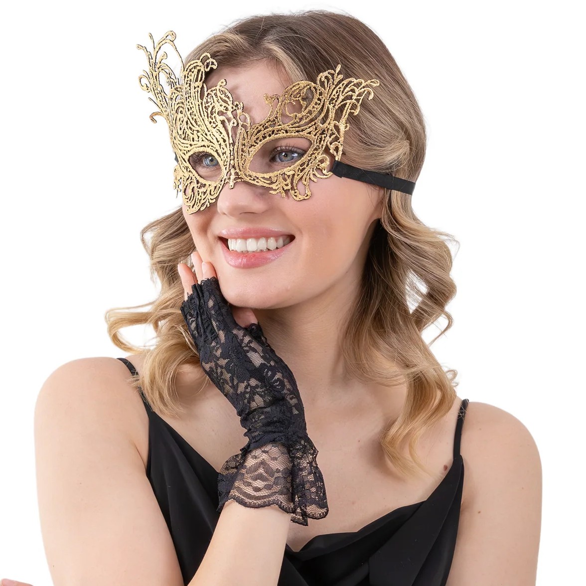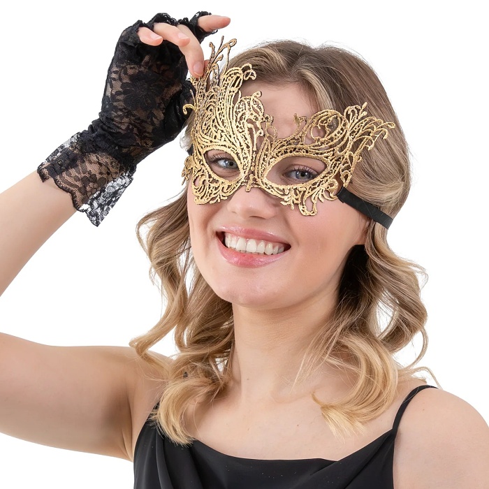 | Benátská krajková maska ve zlaté barvě. Tato slušivá maska se skvěle hodí jako doplněk k outfitu na karneval, tématické … |