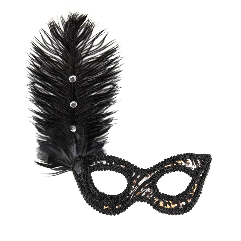 Maska má klasický leopardí vzor připomínající leopardí srst, zdobený výrazným peřím pro jedinečný charakter.