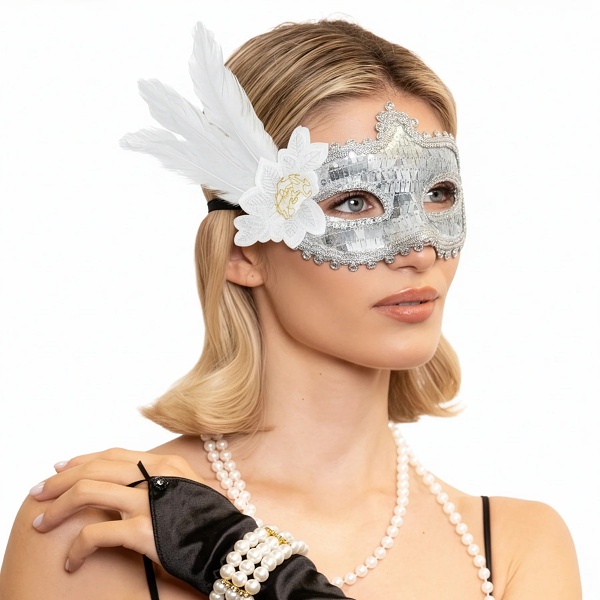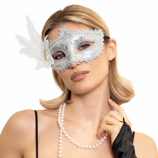 Pak je tato tajemnástříbrná škraboška s peřím ten správný doplněk pro vás. Je vhodná k outfitu na Novoroční oslavy nebo tématickou párty.