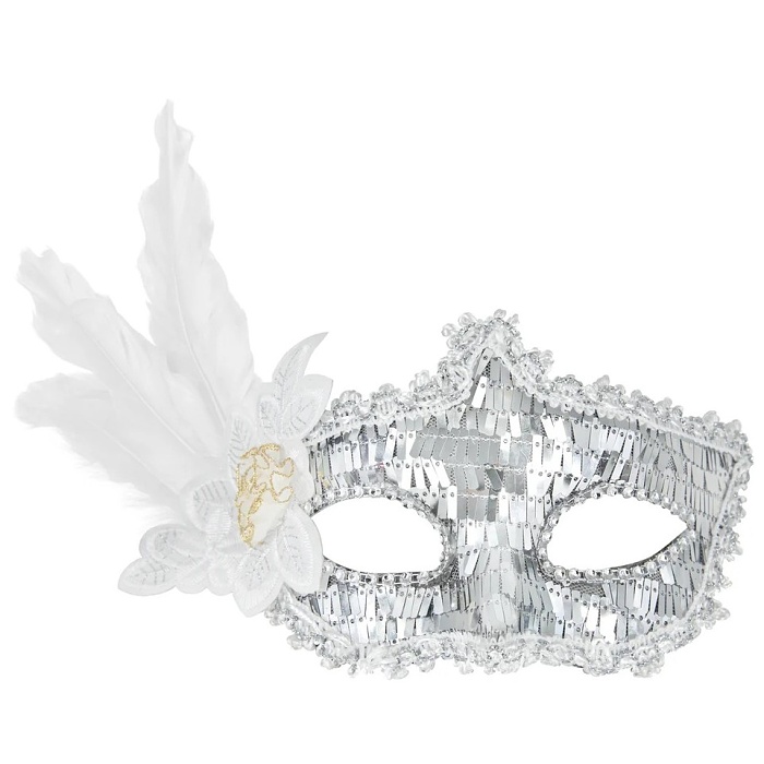 Doplňte si svůj krásný kostým touto fantastickou a svůdnou škraboškou. Je ozdobená peřím a velkou květinou, připevněnou na boku a je navíc ozdobená flitry, které jí dodávají skutečně výrazný vzhled.
