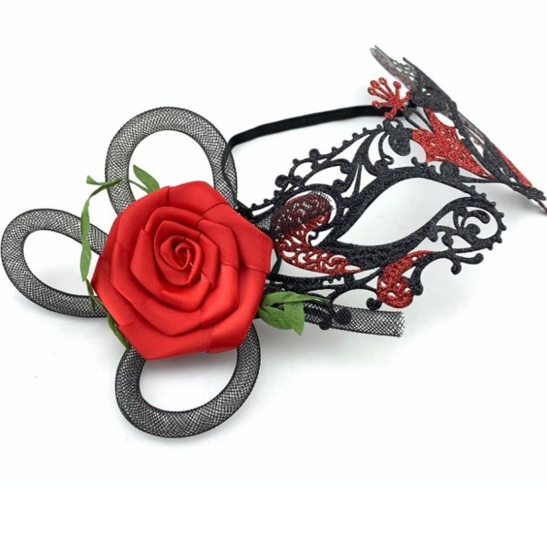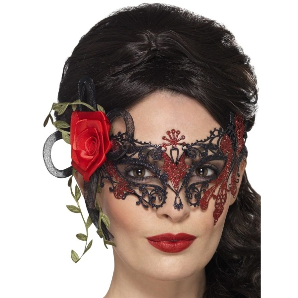 Pozvěte své přátele na Halloweenský večer a přivítejte je jako tajemná dáma, která má ukrytou svou tvář pod touto luxusní filigránovou škraboškou s rudou růží po straně.