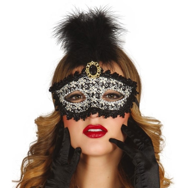 Vyztužená maska je zakončená černou krajkou. Maska je navíc zdobená černými třpytkami a stříbrnými vzory.