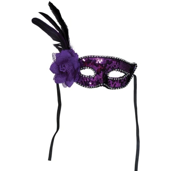 Hledáte krásnou, elegantní a zároveň sexy škrabošku pro váš tématický večírek? Pak je tato tajemná fialová škraboška s flitry, velkou květinou a peřím ten správný doplněk pro vás. Je vhodná k outfitu na Novoroční oslavy nebo tématickou párty.