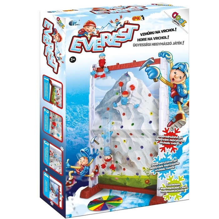 Společenská hra Everest představuje zábavnou a napínavou aktivitu pro celou rodinu, která simuluje zdolávání nejvyšších hor světa. Hráči mají za úkol dostat své dva horolezce až na vrchol Everestu dříve než soupeře. Hra je koncipována jako vertikální horolezecká výzva, kde se horolezci pohybují po barevných chytkách, které jsou rozmístěny na plastovém panelu s vyobrazením zasněžené hory. Každý plastový horolezec je s pohyblivými končetinami, které umožňují uchopení barevných chytů a postupné stoupání.