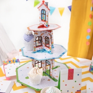 Dekorativní stojan na cupcakes a dezerty Block připomíná třípatrový dům, postavený z kostek.