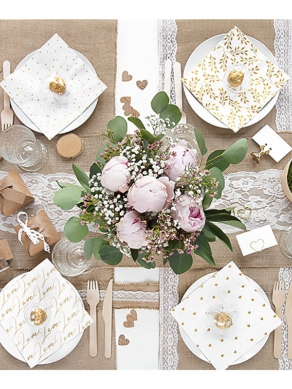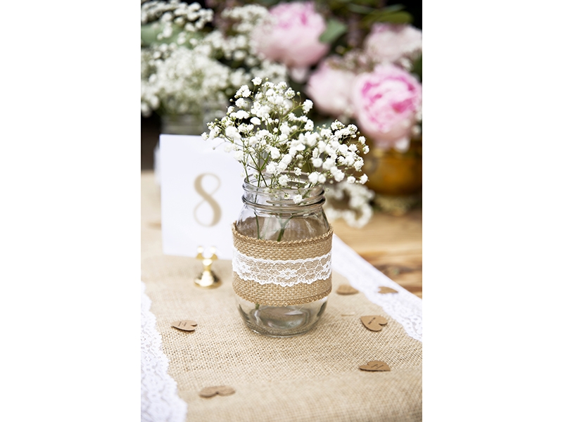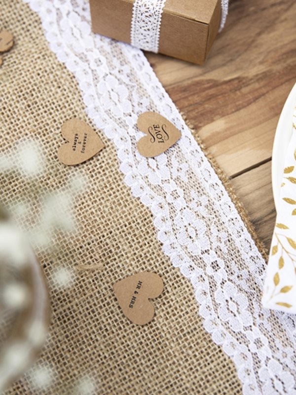 Krásná romantická jutová šerpa s krajkovým lemem. Textilní šerpa se hodí na všechny slavnostní tabule v přírodním stylu. Vaše slavnostní nebo svatební tabule může být stylová a krásná.