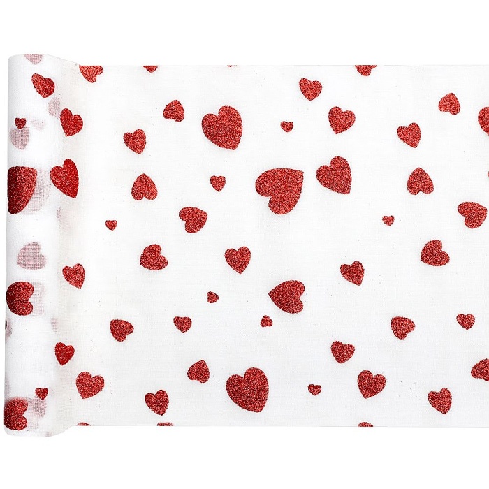 Bílá polyesterová voálová látka je s potiskem červených srdíček.
