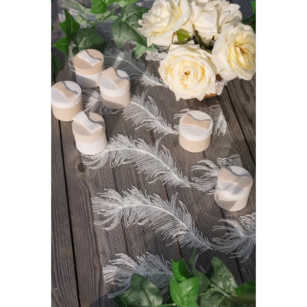 Krásná a elegantní stolová středová šerpa s bílými peříčky.