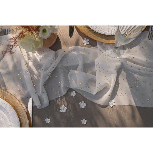Stolová šerpa v roli v bílé barvě se zlatými puntíky, které vytváří krásný sváteční efekt, je vhodná pro mnoho příležitostí.