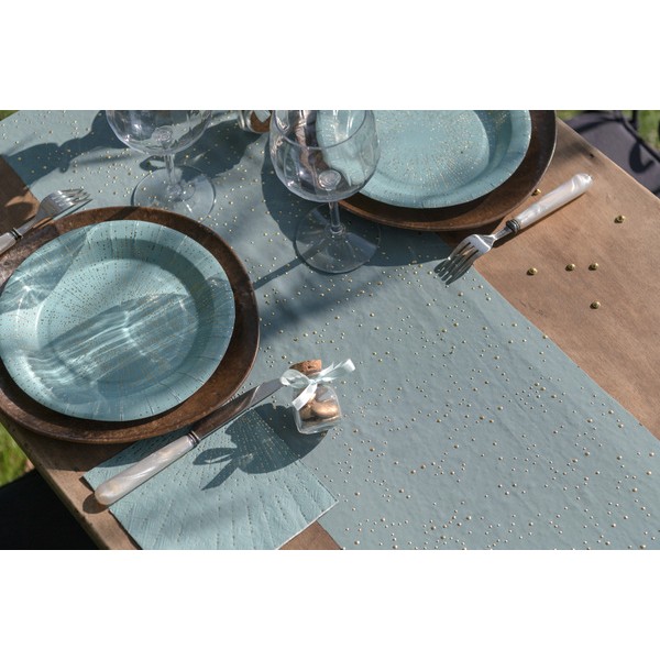 Stolová šerpa v roli v barvě eukalyptu se zlatými puntíky, které vytváří krásný sváteční efekt, je vhodná pro mnoho příležitostí.