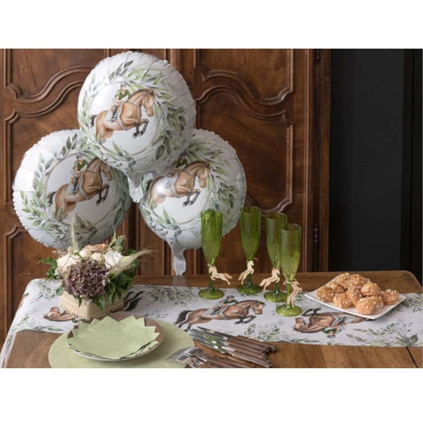 Cválající kůň na pozadí s lístečky vám nádherně doplní stolování na tématické párty s koníky.