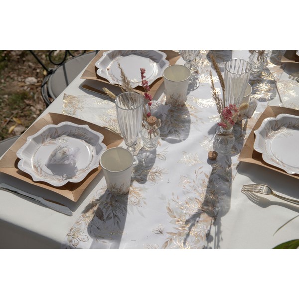 Je slonovinové barvy se přírodním a zlatým květinovým potiskem lístků