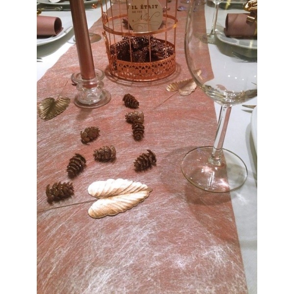 Šerpa stolová v barvě růžového zlata je vyrobena z netkané polyesterové tkaniny.