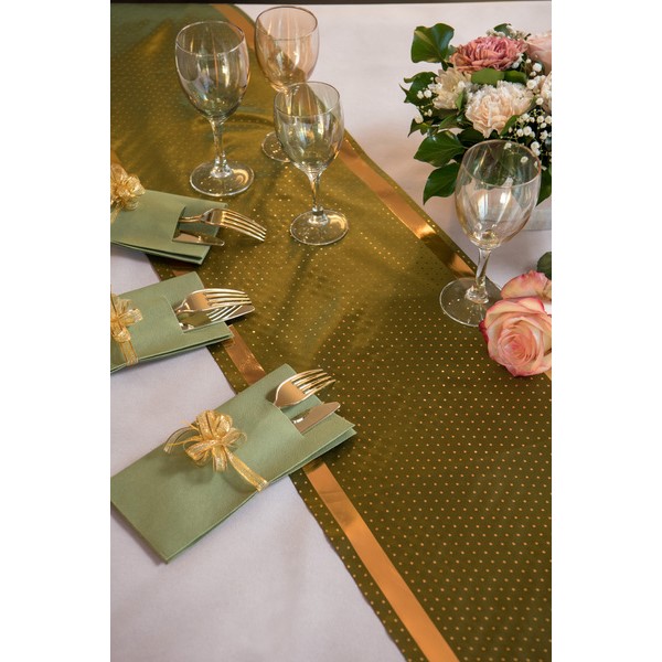 Elegantní stolová šerpa v olivové barvě se širším zlatým okrajem a puntíky