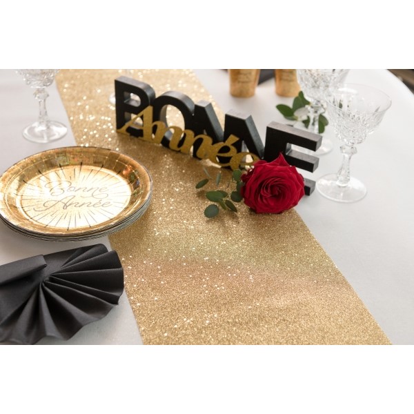 Stolová šerpa ve zlaté barvě s glitry, které vytváří krásný třpytivý efekt, je vhodná pro mnoho příležitostí.
