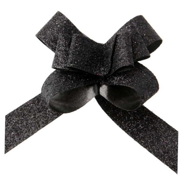 Stahovací mašle černá glitrová, se kterou ozdobíte rychle každé místo vaší oslavy. Mašle se snadno vytvaruje jedním stáhnutím. Působí slavnostně a dobře drží tvar. Mašle se využíjí k rychlému balení dárků, květin, dárkových košů. Jsou i vítaným pomocníkem při dekoraci na svatbách, narozeninách, vánocích.