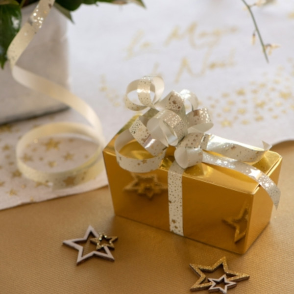 | Krásná krémově zlatá stuha s hvězdičkami se hodí pro ozdobení dárků i nejrůznějších dekorací. Šířka 10 mm, délka 25 m |