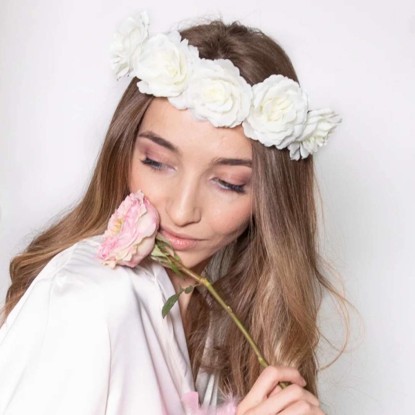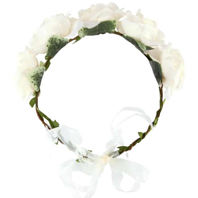 Věneček tvoří 5 krásných růží, jejichž bílou barvu zvýrazňují jemné zelené lístky, umístěné po celém obvodu. Díky tomu věnec působí velmi přirozeně a decentně podtrhne krásu každé ženy. Nastavitelná velikost věnečku umožňuje, aby byl vhodný na různé velikosti hlavy, takže jej mohou nosit dívky i dospělé ženy.