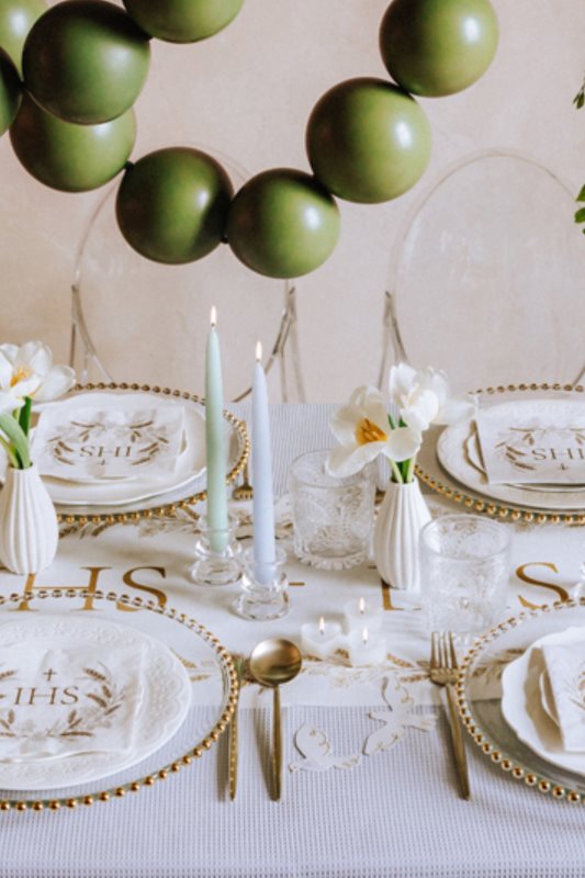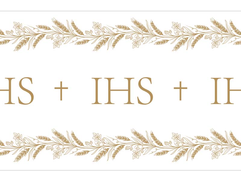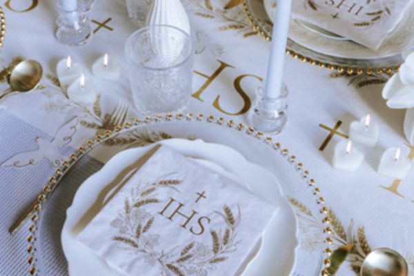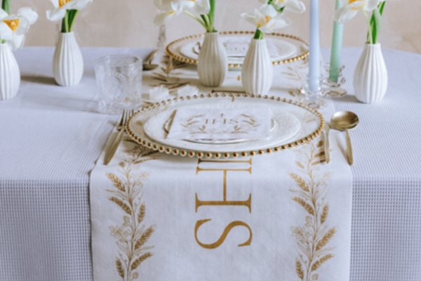 Běhoun na stůl pro přijímání z netkané textilie v bílé barvě se zlatým potiskem. Šířka cca 40 cm, délka cca 5 m.