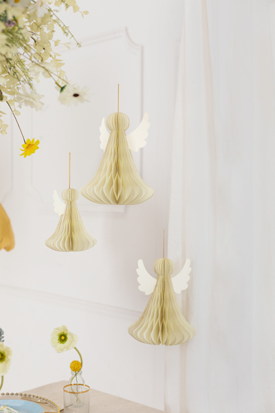 Papírová dekorace Anděl včelí plástve v barvě slonové kosti se zlatými třpytkami, výška cca 24 cm.