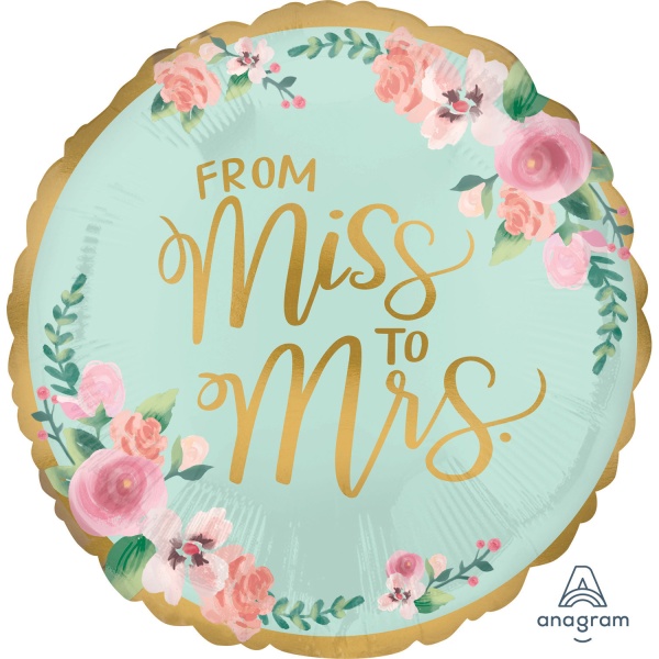 Balónek fóliový v mintové barvě s nápisem From Miss to Mrs je vhodný jako dekorace na zásnubní večírek,