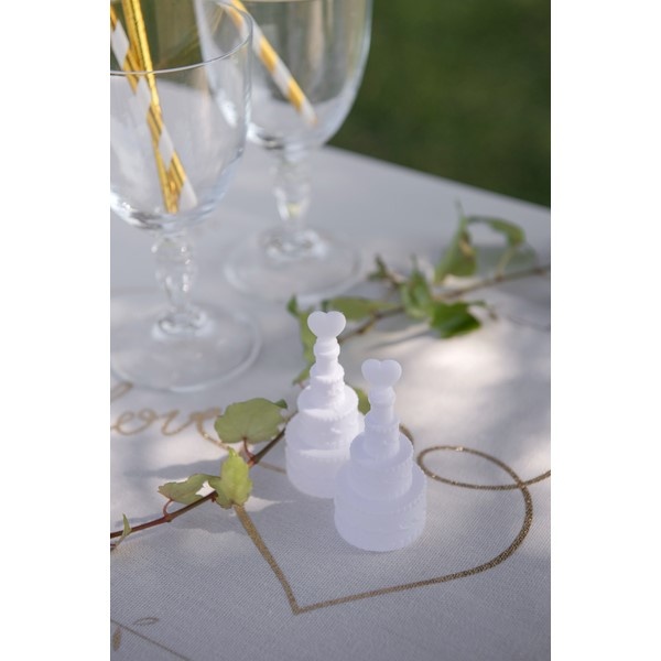 Bublifuk bílé barvy ve tvaru třípatrového svatebního dortu se srdíčkem je originální svatební dekorace, která by neměla na žádném svatebním stole chybět.