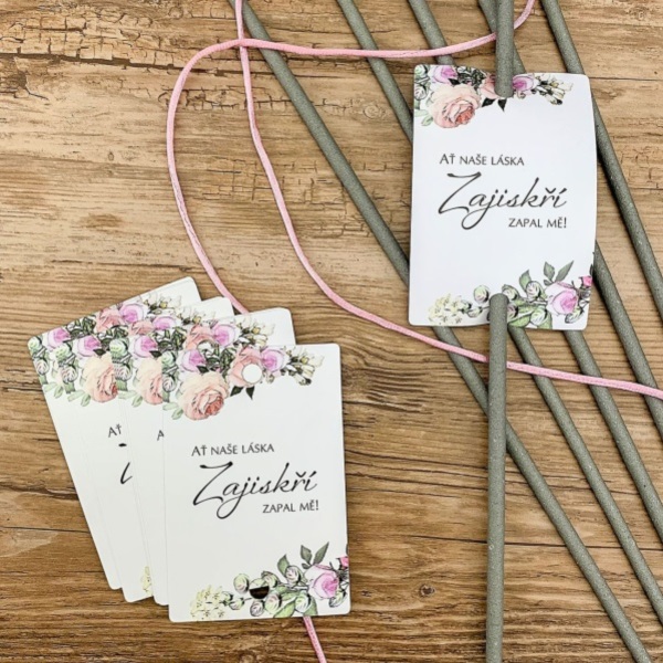 Nejenže jde o zpestření podvečerní zábavy, ale zároveň se u nich také pořídí úžasné fotky. A proto aby svatebčané věděli, na kdy je tato zábava naplánovaná, poslouží tato tzv. kartička k navlečení na svatební prskavky. Je z bílého papíru a má potisk růží s nápisem Ať naše láska zajiskří. Zapal mě.