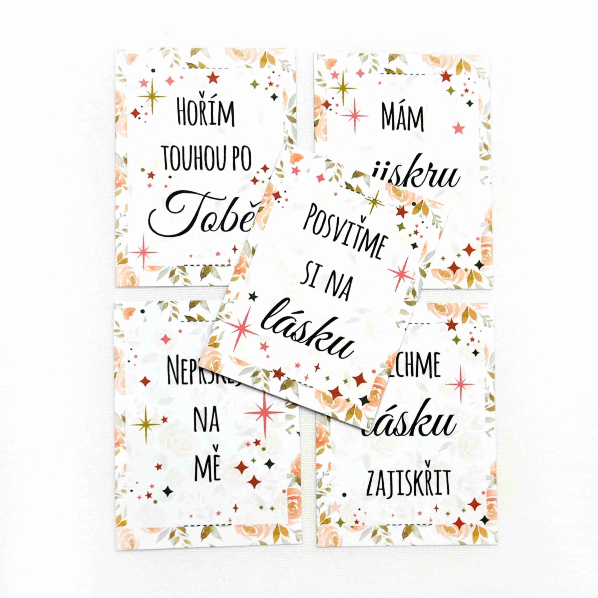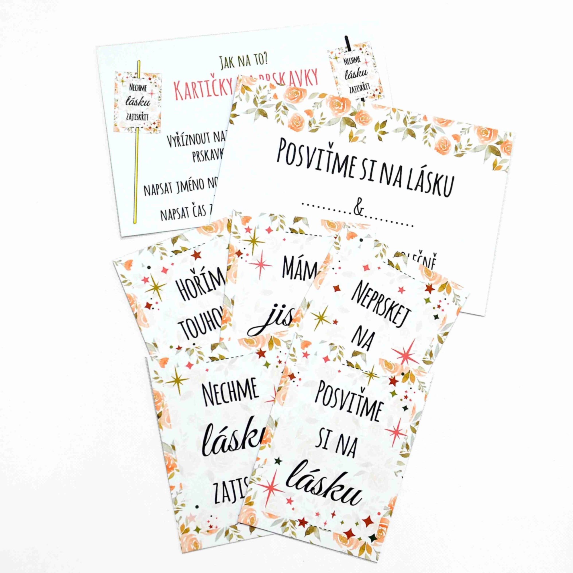 Svatební prskavky se stávají fenoménem na svatebních fotografiích. Už jste si zkusili vykouzlit zářící svatební srdce po setmění? Zapálené prskavky rozdané mezi hosty Vám pomohou vytvořit ty nejkrásnější svatební vzpomínky a fotografie. Balíček obsahuje 5 designových kartiček na prskavky v krásném květinovém dekoru, každé s trochu jiným svatebním mottem. Set zároveň obsahuje 2 letáčky. Jeden, který hosty zve na ohnivou show, kdy mohou prskavky použít a druhý letáček je instruktážní kartičkou která svatební hosty poučí k čemu prskavky slouží. Vychutnejte si sílu okamžiku a zapojte svatební hosty do romantické show Vaší svatební noci.