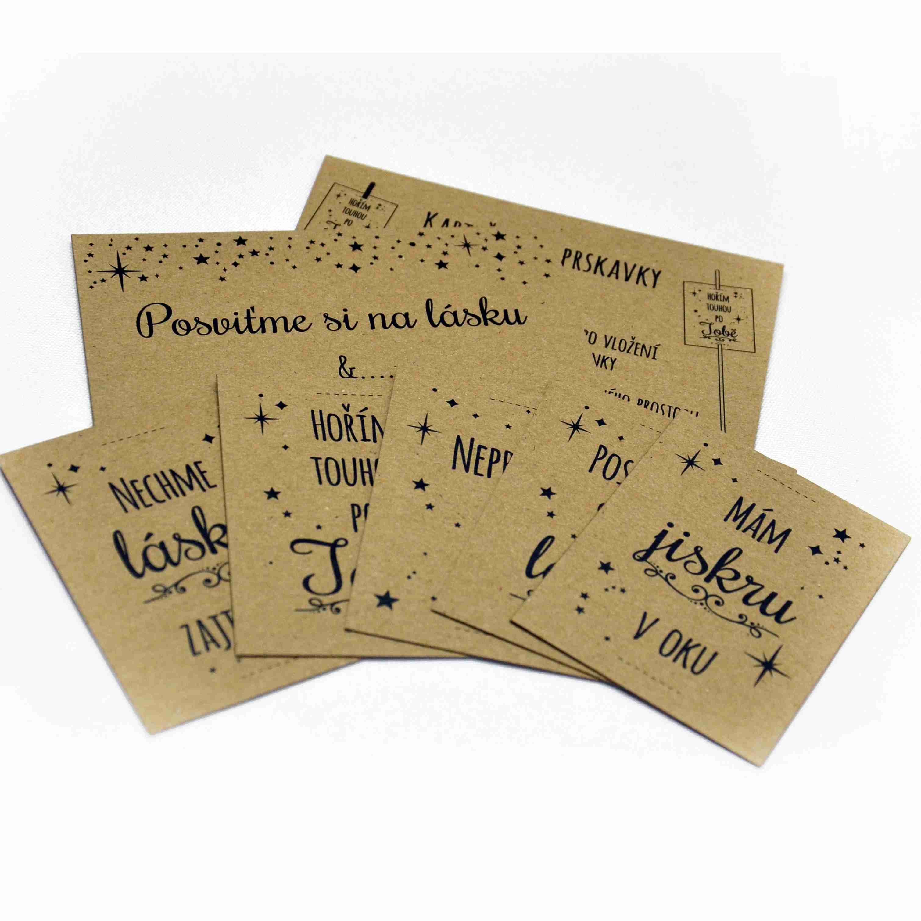 Svatební prskavky se stávají fenoménem na svatebních fotografiích. Už jste si zkusili vykouzlit zářící svatební srdce po setmění? Zapálené prskavky rozdané mezi hosty Vám pomohou vytvořit ty nejkrásnější svatební vzpomínky a fotografie. Balíček obsahuje 5 designových kartiček na prskavky v nature stylu, každé s trochu jiným svatebním mottem. Set zároveň obsahuje 2 letáčky. Jeden, který hosty zve na ohnivou show, kdy mohou prskavky použít a druhý letáček je instruktážní kartičkou která svatební hosty poučí k čemu prskavky slouží. Vychutnejte si sílu okamžiku a zapojte svatební hosty do romantické show Vaší svatební noci.