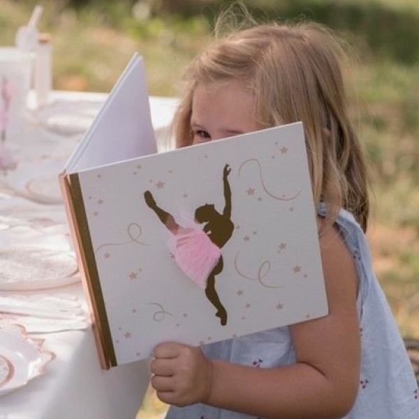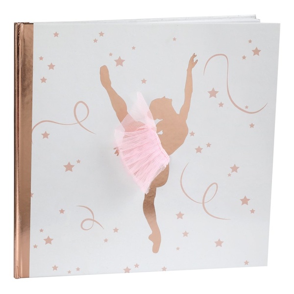 Tato krásná kniha návštěv je s lesklými stránkami, přední strana je zdobena balerínou v tylové tutu sukýnce.