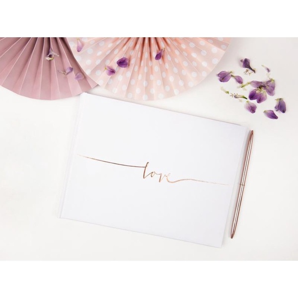 Bílá svatební kniha s pevnou vazbou s nápisem Love v barvě růžového zlata.