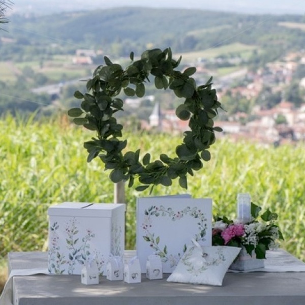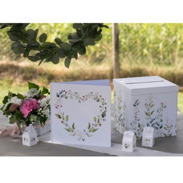 Je určena na vpisování přání a gratulací novomanželům od svatebních hostů po obřadu a během svatební hostiny. Svatební kniha s květinovým dekorem s lístečky do tvaru srdce má 20 prázdných listů / 40 stran.