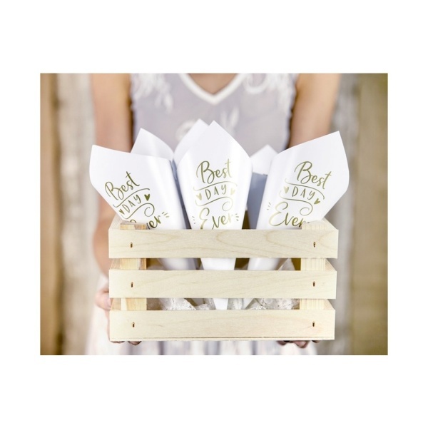 Svatební kornoutky se zlatým nápisem "Nejlepší den" jsou idální na plátky růží, papírové konfety, na rýži nebo na bonbónky pro nejmenší svatebčany.