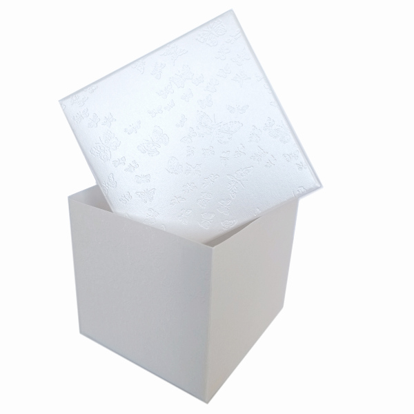 Perleťově bílé krabičky s embosovaným dekorem motýlků budou vypadat nádherně na svatební tabuli. Použijte je na drobný dáreček pro svatebčany, naplňte je mini koláčky, zdobeným cupcakem, svatebními mandlemi nebo jinou pozorností.