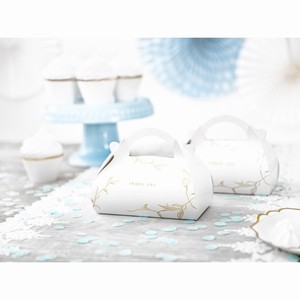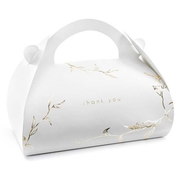 Svatební krabička se zlatými lístky a nápisem Thank you má rozměr 16 x 8,5 x 9,5 cm.
