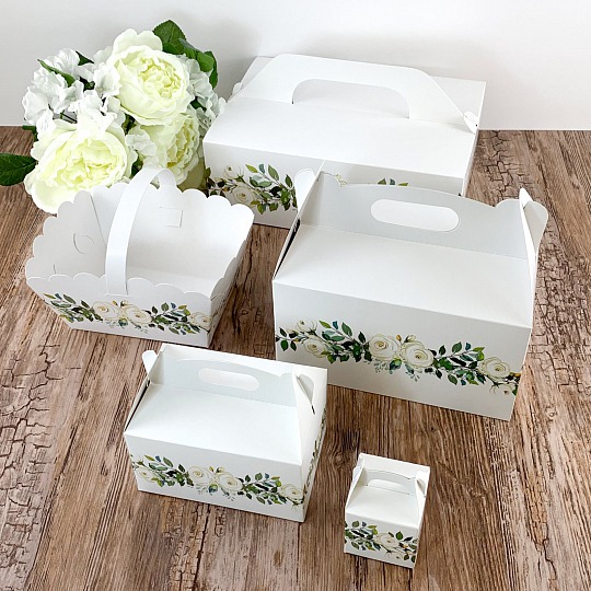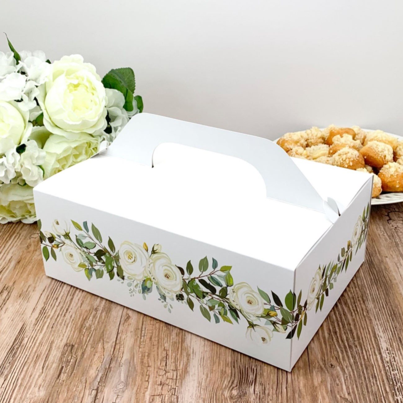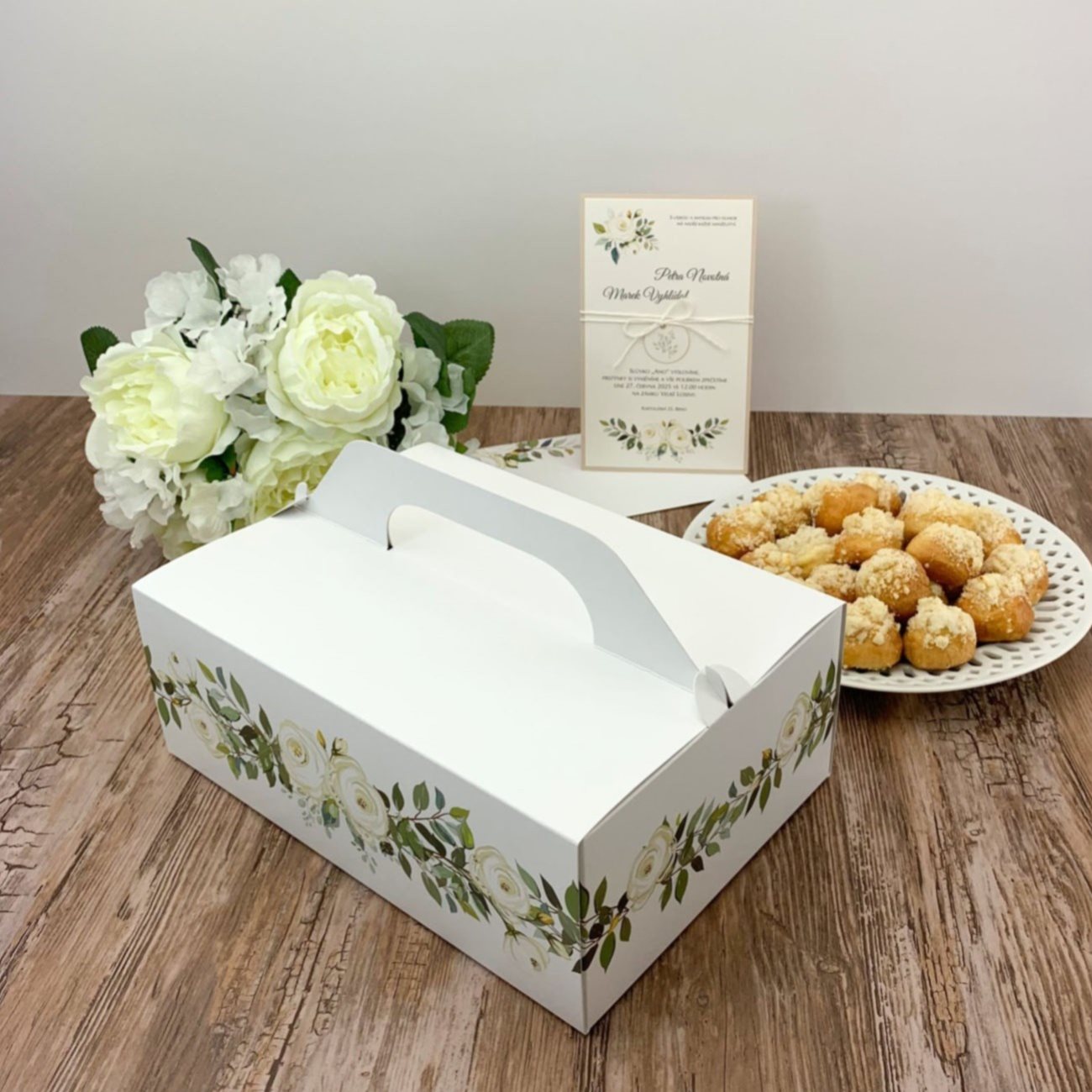 Bílé krabičky s květinovým motivem jsou dostatečně velké, aby se do nich vešlo cukroví, dortíky i koláčky. Krabička je vyrobena z potravinářské lepenky, která má atest pro přímý styk s potravinami. Krabičku dodáváme ve složeném stavu. Tuto krabičku můžete zkombinovat i s dalšími krabičkami ze stejné designové řady.