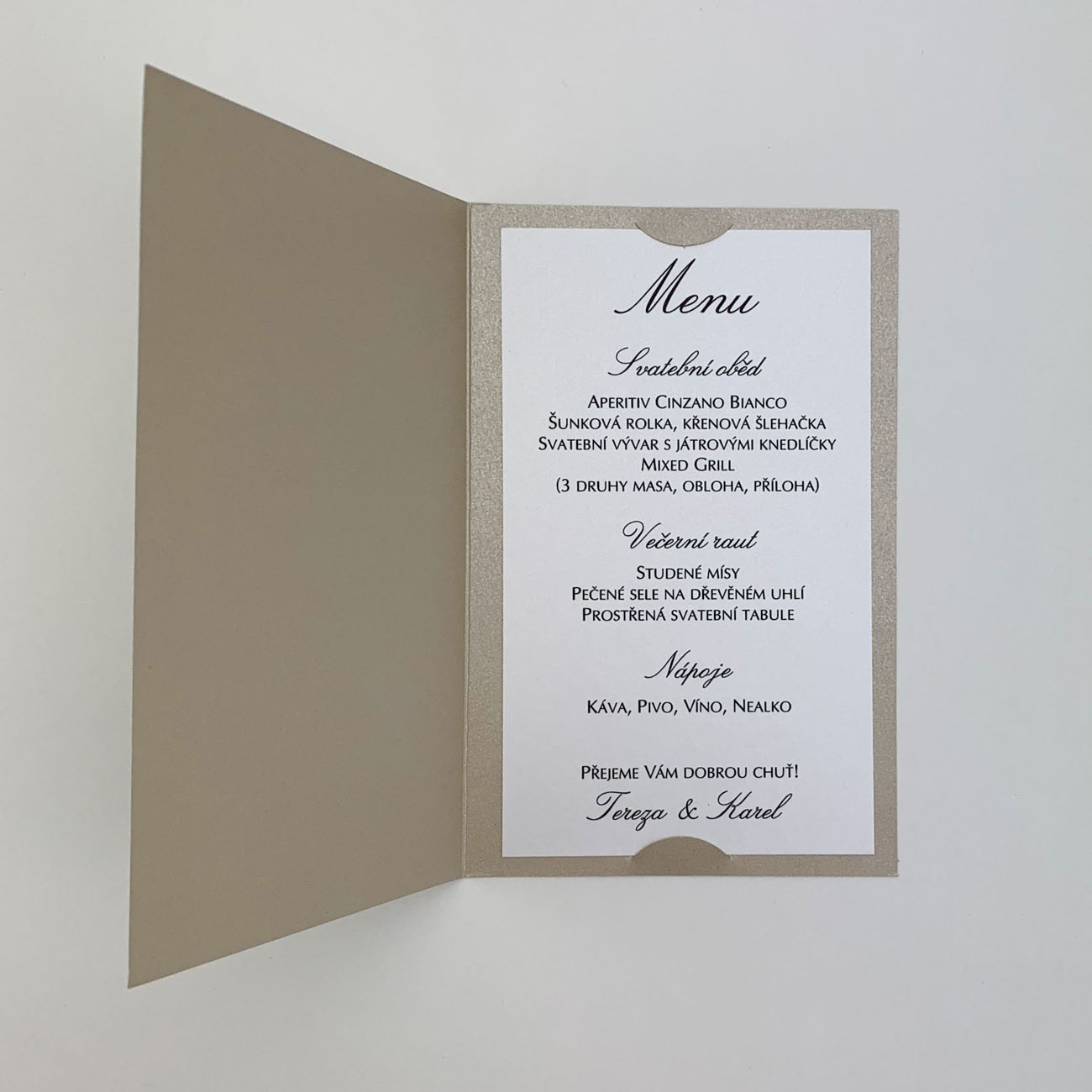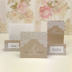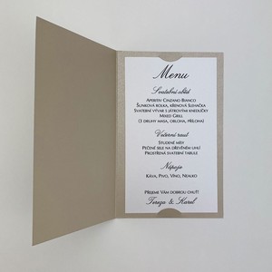 Svatební menu je důležitou soiučástí svatební hostiny, kterou ocení zejména Vaši svatební hosté. Set obalů na menu s jemnou krajkou Vás na první dojem osloví svou romantickou něžností. Je z perleťového papíru v barvě bílé kávy. Na přední straně je motiv natištěn bílým tiskem. Pro vlastní text je určena vnitřní karta, která je vložena do zámečků vnějšího dílu.
