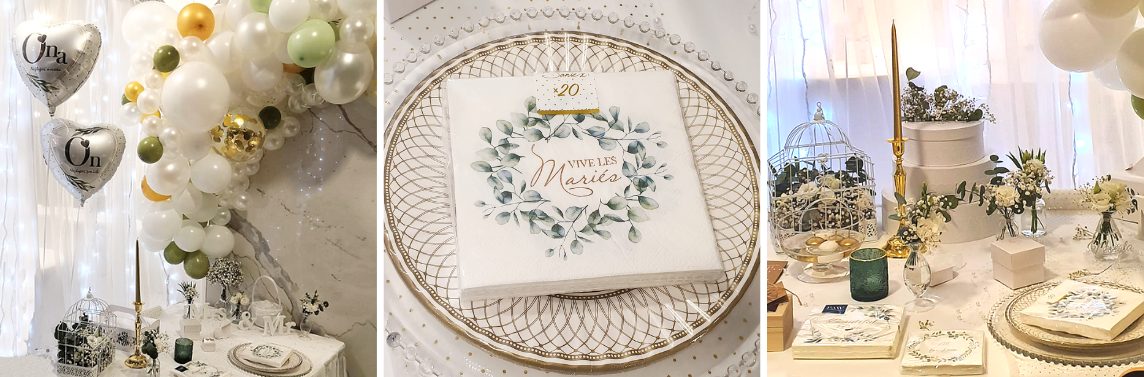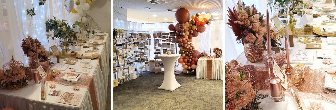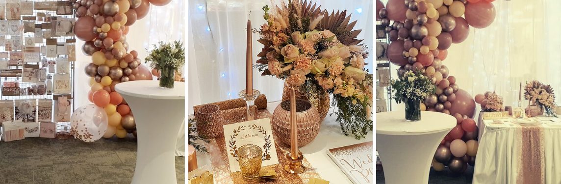 Ty naše patří na svatbu i na noblesní večírky. Svatební fotokoutky, party, rozlučky se svobodou, ale i originální výzdoba ke slavnostmímu obřadu. Organické girlandy a prostorové aranže přinesly svatbám netypickou atmosféru. Velkolepé a výrazné balónkové dekorace s chromovými, zlatými i pastelovými balónky různých velikostí se kombinují s květinami i přírodní sušinou. V naší svatební ukázce jsme prostor vyzdobili rose gold girlandou s korálovými pastelovými tóny, která doplnila honosnou rose gold výzdobu a bílozelenou transparentní girlandou, které lehce splynula s jemnou a romantickou bílozlatou dekorací stolu.