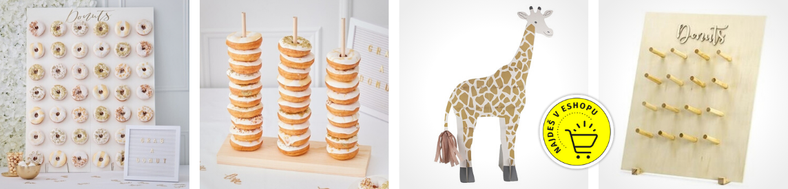 Budete-li ale chtít opravdu udělat dojem, sáhněte po speciálních stojanech na donuty. Určitě jste je už v nějakých luxusních restauracích, na rautech, svatbách nebo firemních večírcích viděli. Máme svatební, dřevěné držáky, dětské - ve tvaru žirafy nebo třeba stojan pro milovníky počítačových her