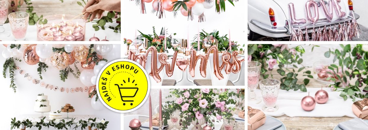 Opravdová novinka a náš zaručený svatební tip! Popularita růžovo-zlatavého odstínu je v současnosti jednou z nejmódnějších barevných variant. Pozor, nemluvíme o cukrkandlové růžové! Barva růžového zlata je měkká, nenásilná a elegantní. V našem e-shopu najdete kategorii s dekoracemi a doplňky i v téhle úžasné barevné kombinaci.