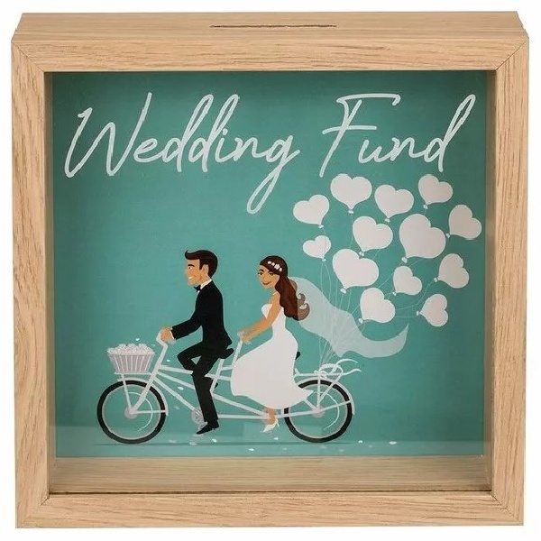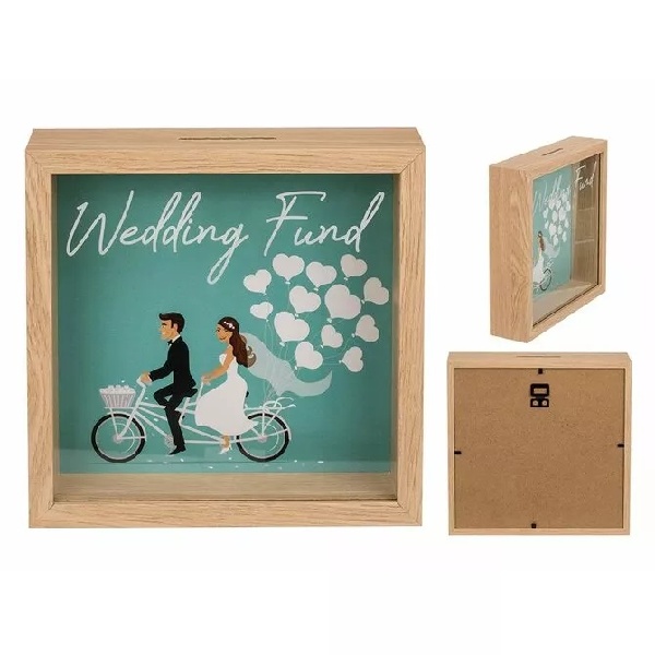 Velmi atraktivní dřevěná pokladnička s pozadím zamilované páru. Na pokladničce je nápis "Wedding Fund", díky čemuž je pokladnička ideální pro společnou svatební cestu.