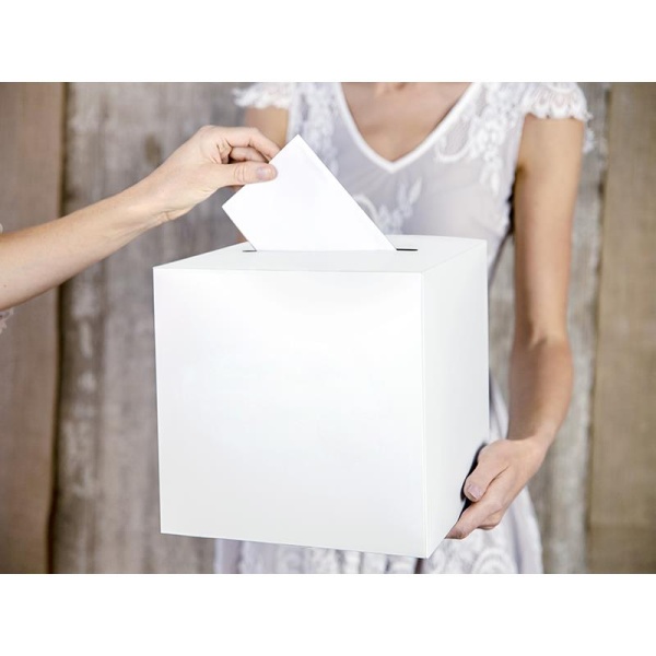 Krabička je s víkem a otvorem pro obálky a je vyrobena z vysoce kvalitního, silného papíru